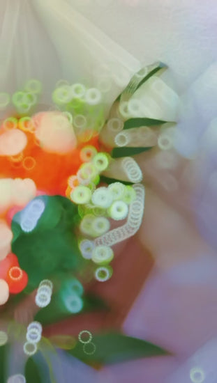باقة جميلة ومميزة من الشمع المعطر على شكل ورود وزهور! تأتي على شكل باقة ورد حقيقية مع قطع شمع ملونة بأشكال ورود وزهور. ألوان جميلة ومتنوعة: برتقالي، وردي، وأبيض. مزينة بأوراق خضراء وزهور صغيرة. مغلفة بورق شفاف أنيق مع شريط رمادي.