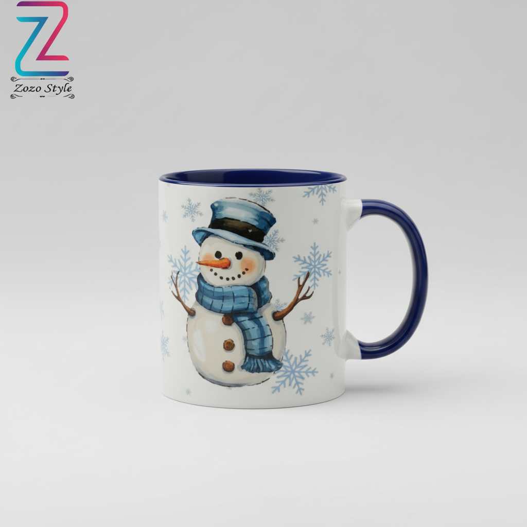 كوب شتوي جميل بتصميم رجل ثلج لطيف مع ندفات الثلج. مثالي لفصل الشتاء والأجواء الباردة!